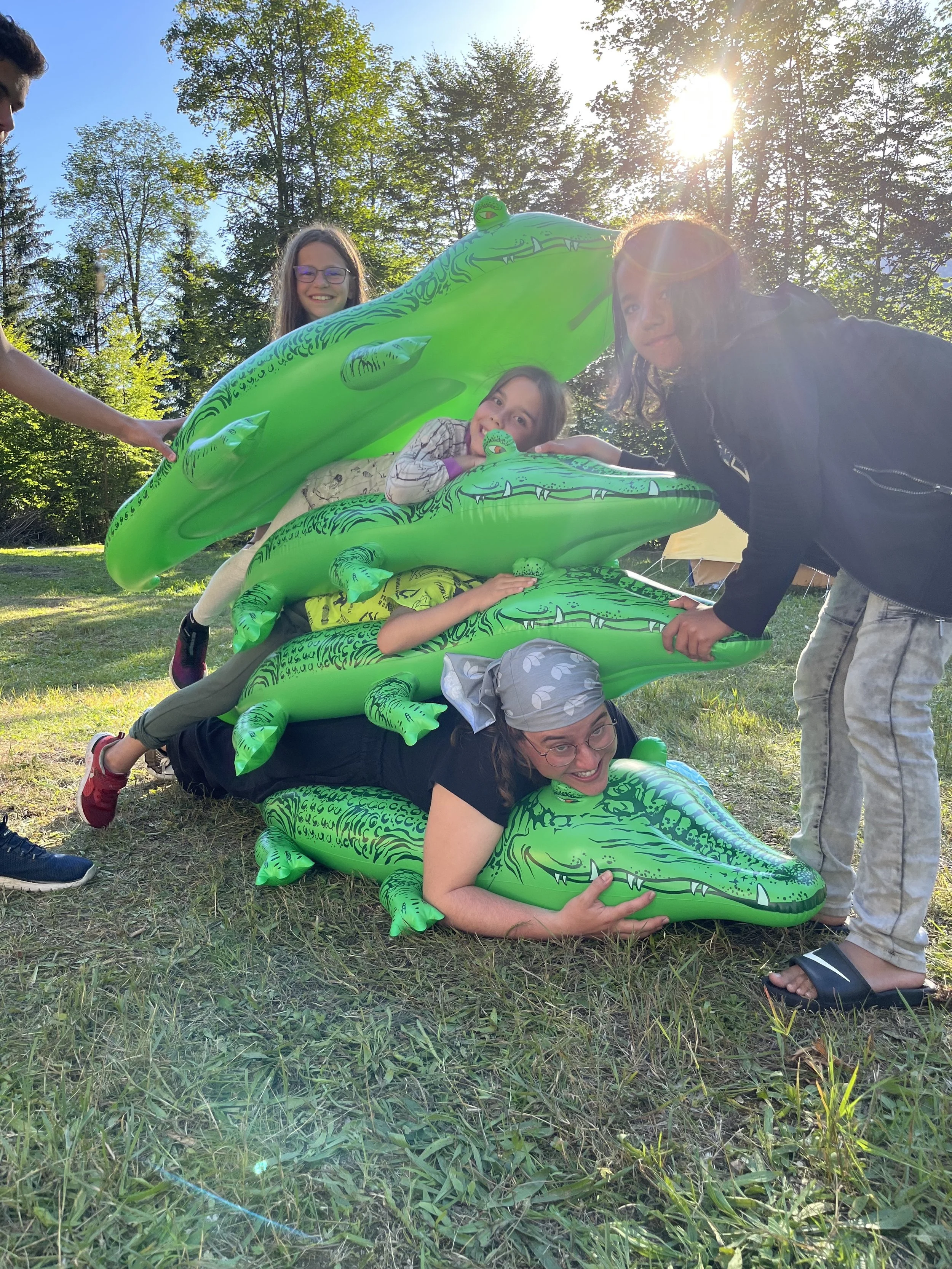 Unser Zeltlager liegt in perfekter Lage nahe des Seestrands am großartigen Achensee, ideal zum Schwimmen und Entspannen inmitten der Alpen. Für Kinder bieten wir ein besonderes Outdoor-Erlebnis mit einem großzügigen Abenteuer-Spielplatz. Hier warten ein Piratenschiff, ein Rutschturm, ein Naturkletterfelsen und ein großer Sandkasten darauf, entdeckt zu werden. Der kleine Abenteuer-Wasserspielpark sorgt für zusätzlichen Spaß: Kinder können Kieselsteinstaumauern errichten, Wasser in Holzrinnen stauen oder in kleinen Seen planschen. Auch bei schlechtem Wetter wird es nie langweilig: Unser Aufenthaltszelt wird bei Bedarf zur Kinderdisco oder Bastelstube umfunktioniert. Wer die Berge liebt, kann sich auf einen Wandertag freuen, bei dem wir einen nahegelegenen Gipfel erklimmen oder den Achensee entlangwandern. Für Abenteuerlustige veranstalten wir außerdem einen spannenden Postenlauf mit kreativen Stationen wie Palatschinkenschupfen, Schätzspielen und Geschicklichkeitswettbewerben. Unser Zeltlager vereint Natur, Spiel und Gemeinschaft – so wird jeder Lagertag, ob bei Sonne oder Regen, zu einem einzigartigen Erlebnis!